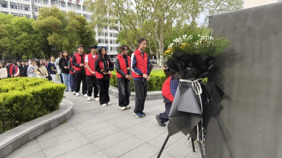 活动中,许志伟党员先锋队、许志伟志愿服务队学生代表为许志伟雕像敬献花篮。全体师生代表面向许志伟雕像肃穆伫立行默哀礼。