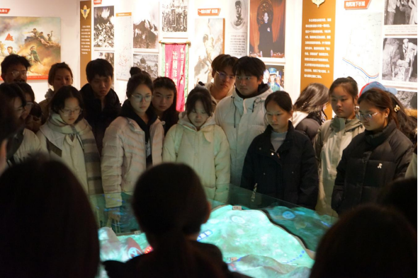 在沙盘面前,借助音响以及声光电营造的场景效果,参观师生一同重温了举世闻名的上甘岭战役。在这场战争史上的奇迹中,特功八连的官兵们浴血奋战43天,坚守坑道14昼夜。八连官兵舍生忘死、前赴后继,最终将布满381个弹孔的战旗插上了上甘岭主峰。“只吹冲锋号,不打退堂鼓!”大家仿佛置身于血与火交织的时光隧道,近距离感受特功八连的先辈们在战场上奋勇拼杀的战斗场景,深入学习了解他们的英雄事迹。